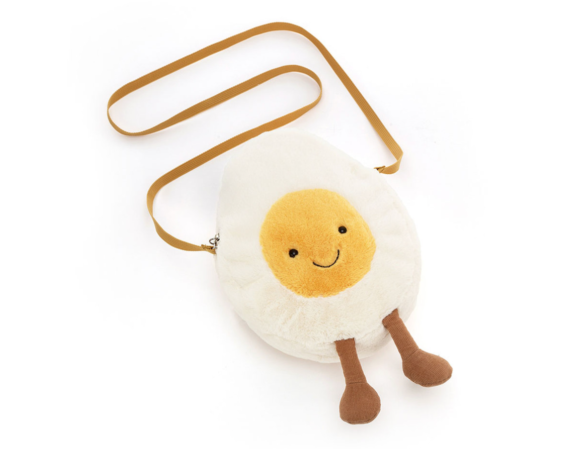 Amuseables Happy Boiled Egg Bag is one chipper champ! Smiley and sunny, with a strong mustard strap, soft white fur and a gorgeous golden yolk, this egg likes to dangle those scrummy cord boots as you skip along together!