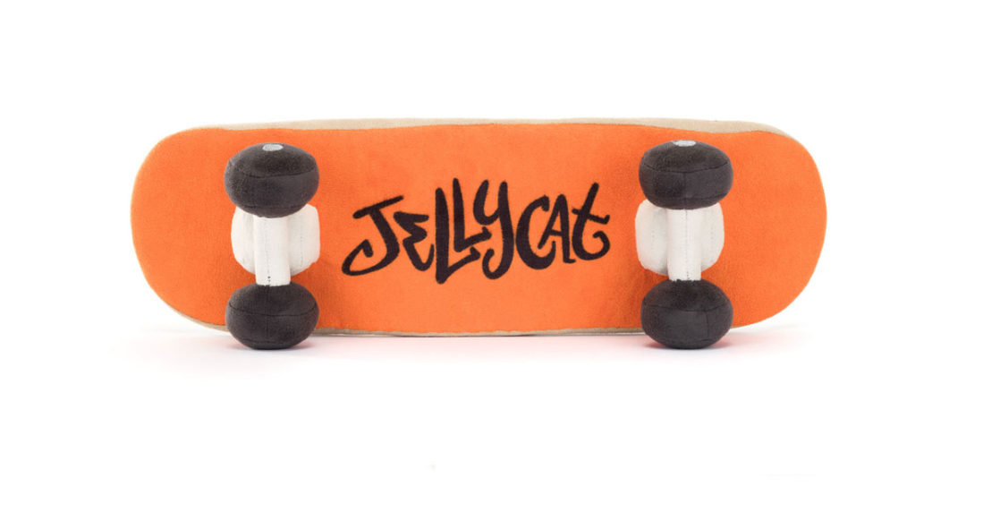 Land tricks and cuddles with Amuseables Sports Skateboarding. In blue suedette with beige edging and a bold orange back, this board can rest on soft charcoal wheels and grey trucks. This smiling skater boasts sweet Jellycat graffiti detail, stitched screws, and fine cord legs with textured trainers.