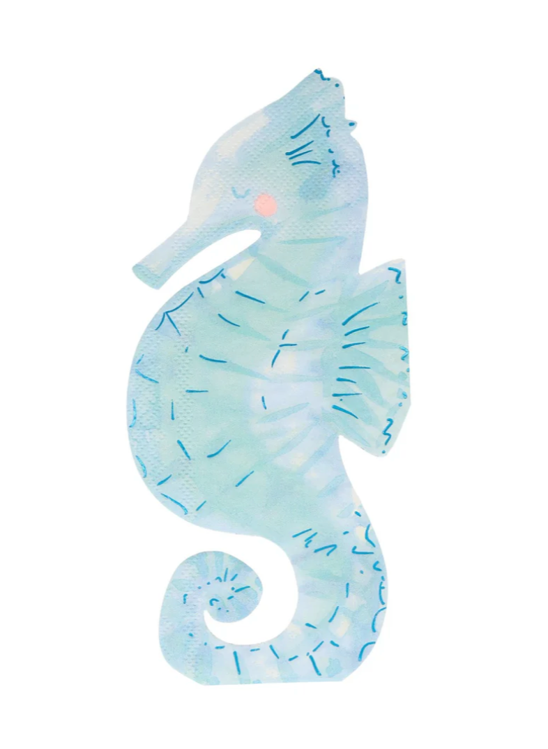These napkins, in the shape of a beautiful seahorse, will look amazing at an under-the-sea or mermaid party. They are printed with ocean colors and brilliant shimmering blue foil detail. A really delightful touch for the party table.