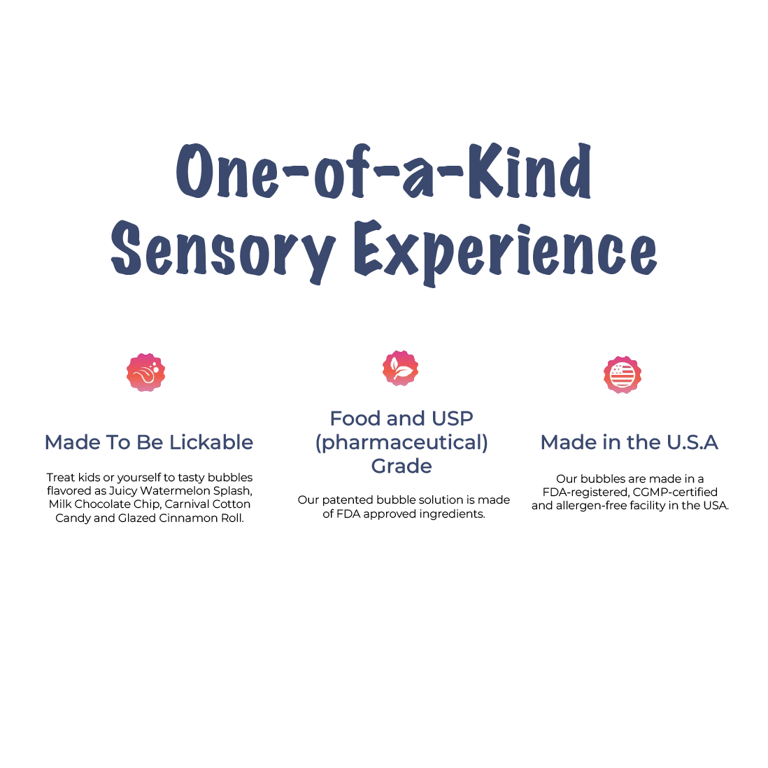 Fun and tasty bubble treats for kids and adults! Safe & tasty bubbles created by pediatricians: BubbleLick are lickable, edible flavored bubbles that taste just like cotton candy. These bubbles are safe and comprised of only Food-Grade and USP (Pharmaceutical) grade ingredients.